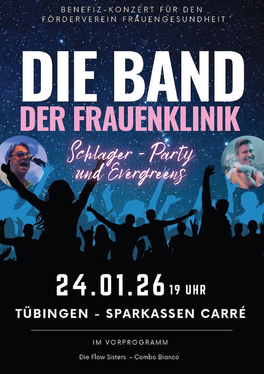 Wir laden euch herzlich zu einem besonderen Konzertabend ein! Unter der Schirmherrschaft von Frau Prof. Dr. Sara Brucker spielt am 24. Januar 2026 um 19:00 Uhr (ab 18:00 Uhr Einlass) die Band der Frauenklinik Tübingen – und das für den guten Zweck!